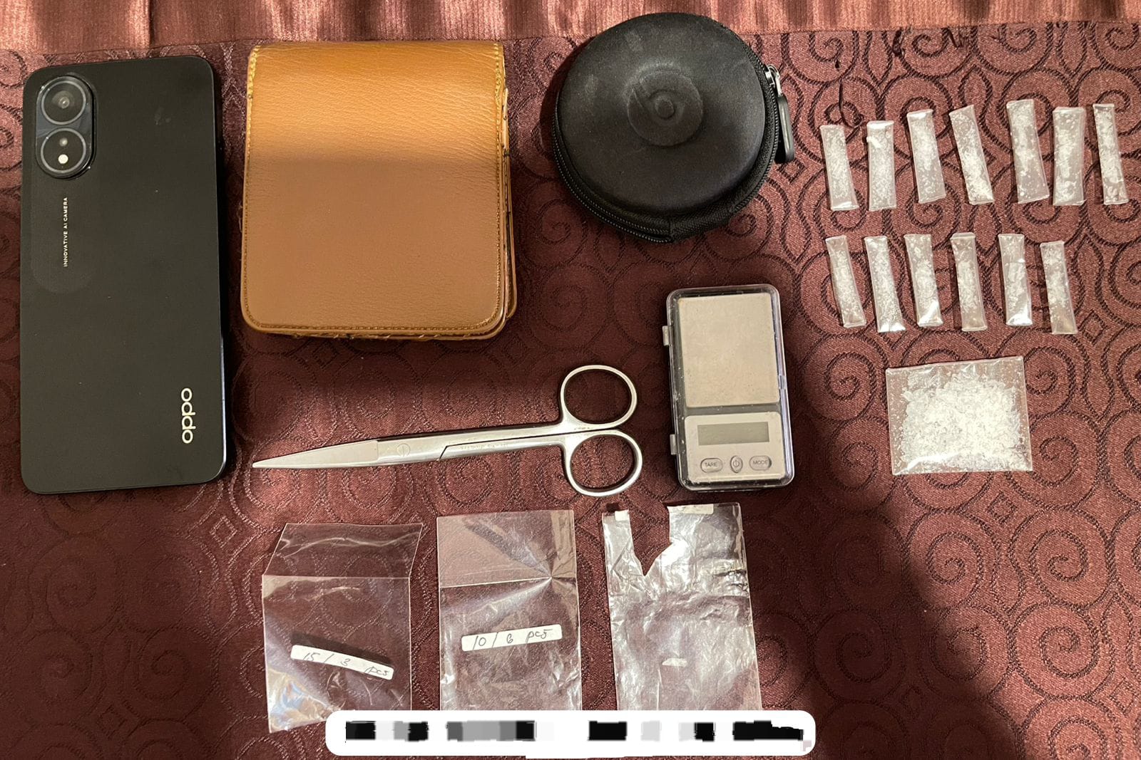 Meskipun tidak ditemukan narkotika siap edar pada saat penangkapan, petugas menemukan sebuah kotak bertuliskan The New English Dictionary di dalam kamar tersangka yang ternyata digunakan untuk menyembunyikan dua unit timbangan digital dan satu pak plastik bening kosong.