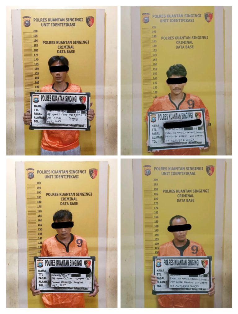 Kapolres Kuantan Singingi AKBP Pangucap Priyo Soegito, S.I.K., M.H, melalui Kasat Narkoba Iptu Novris H Simanjuntak, S.H., M.H, mengungkapkan, “Pelaku RI (32) dan ES (33) diduga merupakan pengedar narkotika jenis sabu, sedangkan NM (39) dan IA (24) adalah penyalah guna. Ada tiga lokasi penangkapan terkait pengungkapan kasus penyalahgunaan narkotika jenis sabu ini., Kamis (05-10-23).